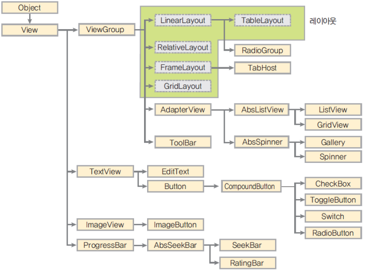 최상위에 Object(java.lang.Object) 클래스가 있고 이를 상속받은 View클래스가 있다.